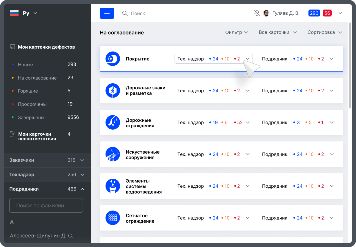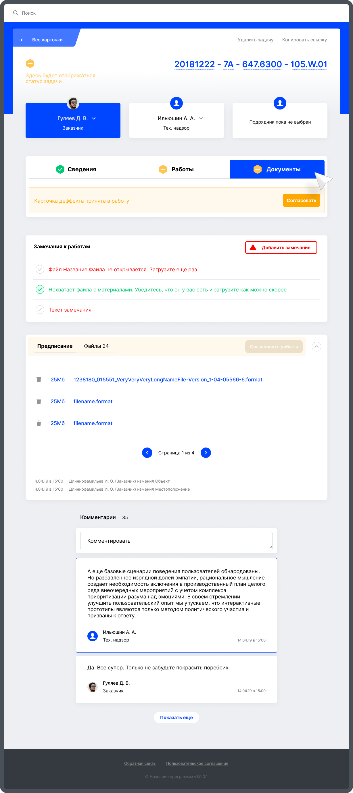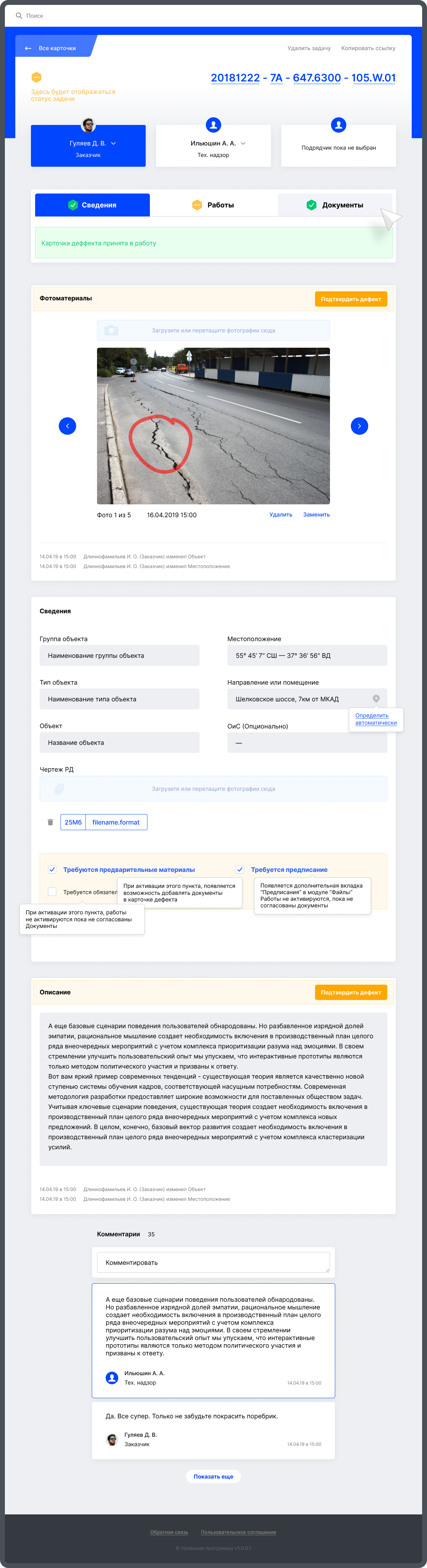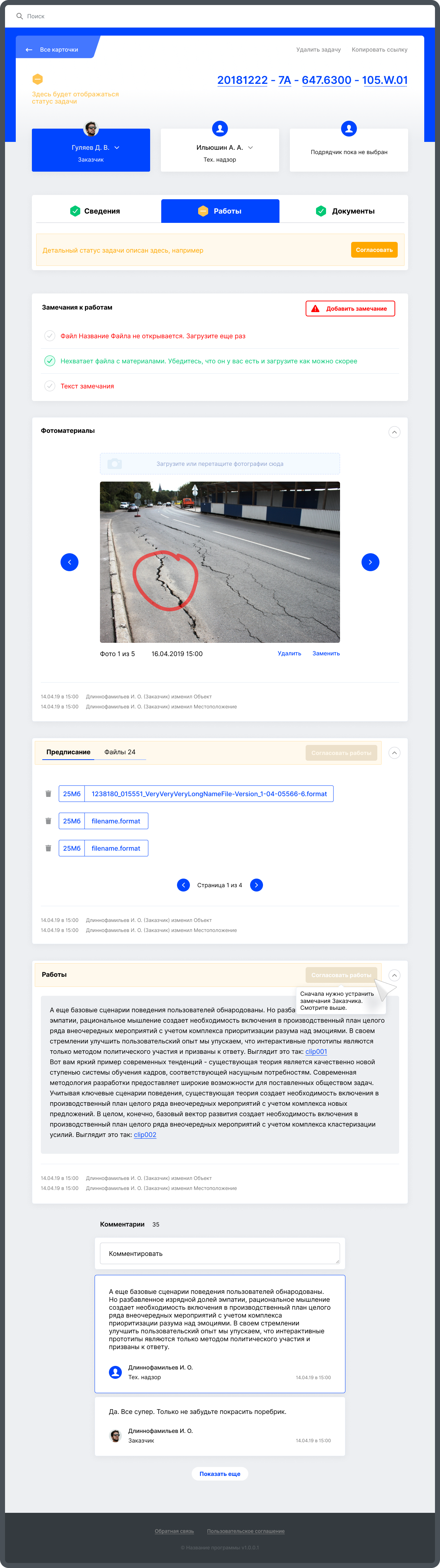 Заказчик видит и принимает или не принимает отдельные ключевые этапы по карточке. Если какой-то из пунктов все еще красный, задача остается открытой. Участники видят где у них остановился процесс, могут кликнуть по области и страница сама откроет нужную область