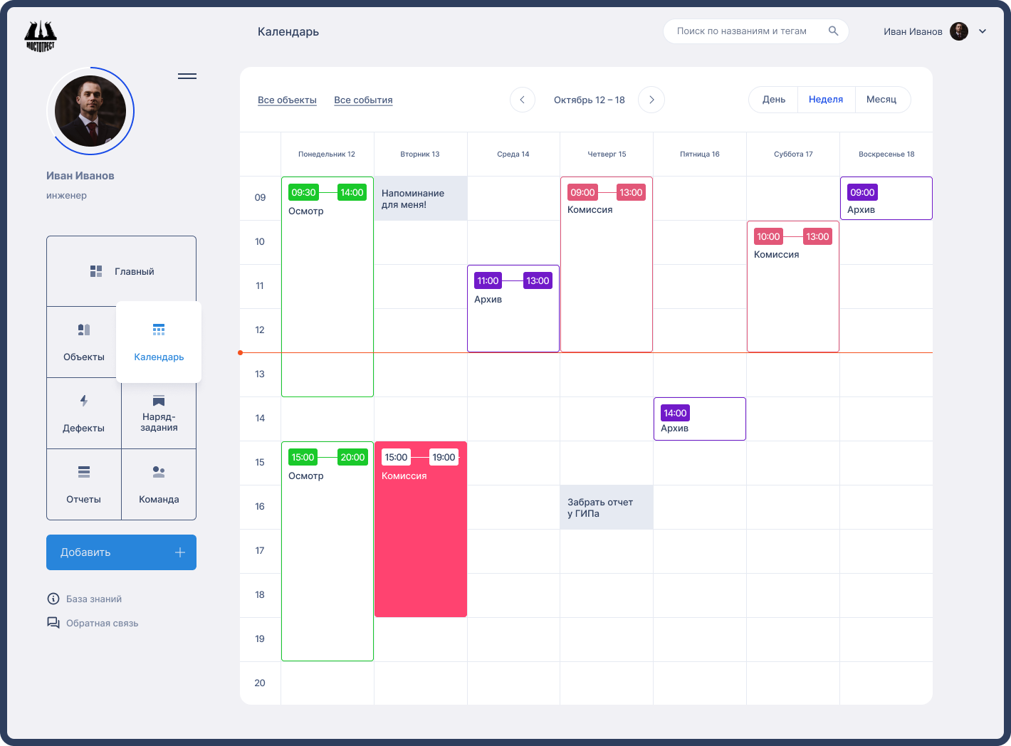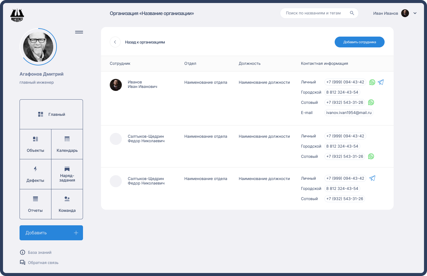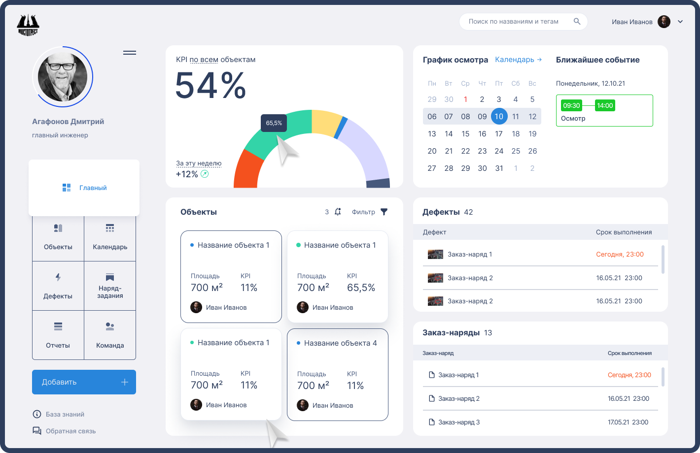 Главный экран представляет собой дашборд, в котором представлена основная информация с возможностью перехода к ней. Также пользователь видит свои KPI, которыми могут выступать