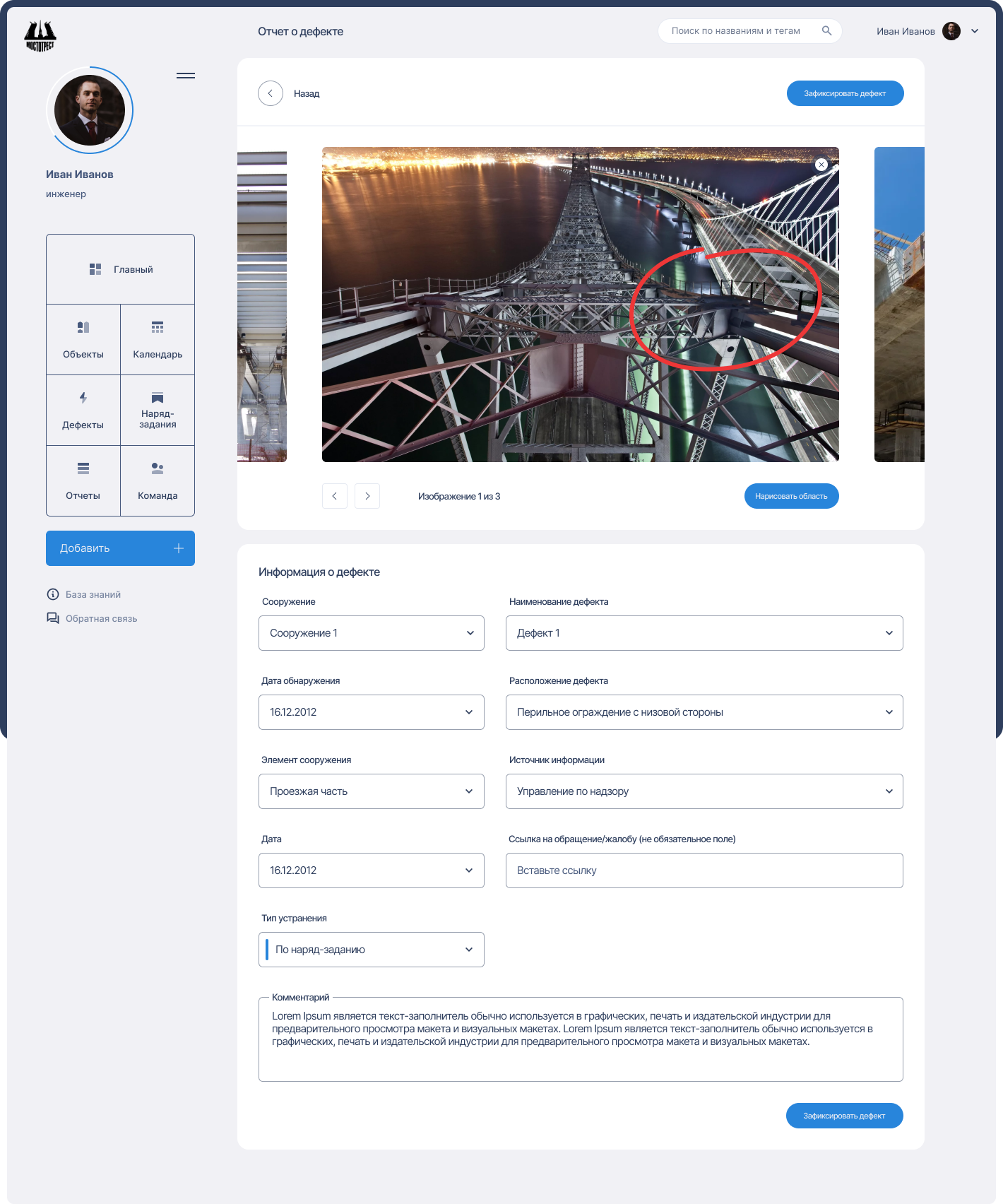 В дефекте фиксируются необходимые данные о локации, типе устранения; На фотографиях можно делать пометки.