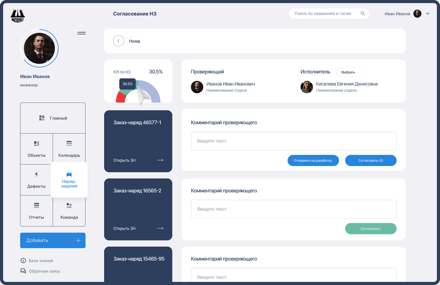 Отслеживание прогресса по наряд-заданию, возможность оставить комментарий для исполнителя прежде чем согласовать — всё на одном экране